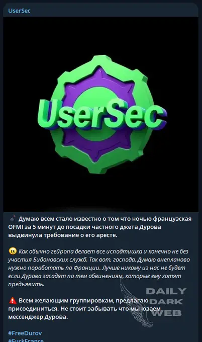 UserSec, a notorious cyber threat actor group, was one of the first to respond to the news of Durov’s arrest. The group issued a call to action, urging others to join in their efforts to retaliate against the French government. Leveraging Durov’s own platform, UserSec declared their intention to carry out widespread Distributed Denial-of-Service (DDoS) attacks against French institutions.