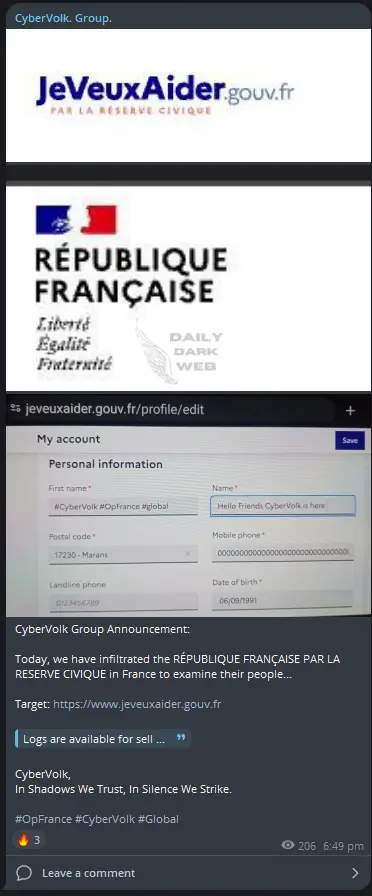Another significant player in the retaliation campaign is CyberVolk, a group that quickly claimed responsibility for infiltrating French government systems. They specifically targeted the Réserve Civique website, which is a key component of France’s civic engagement and volunteer services. CyberVolk’s announcement included the release of sensitive information obtained from their breach, showcasing their ability to access and manipulate French government databases.