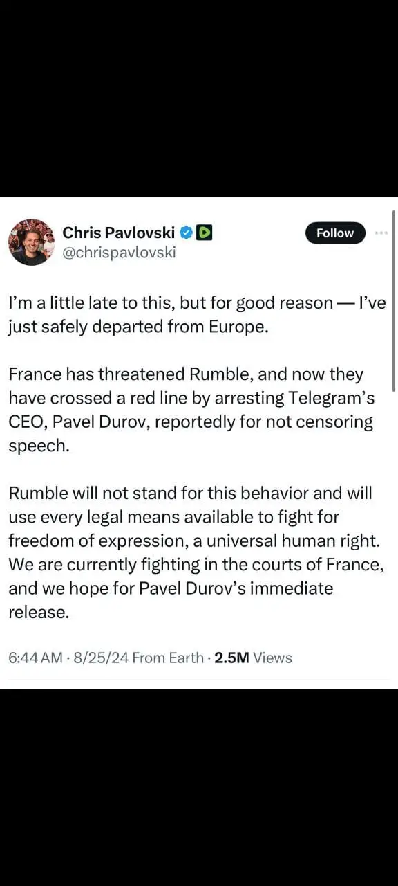 Rumble CEO Chris Pavlovski Responds to France’s Actions Against Telegram’s Pavel Durov
