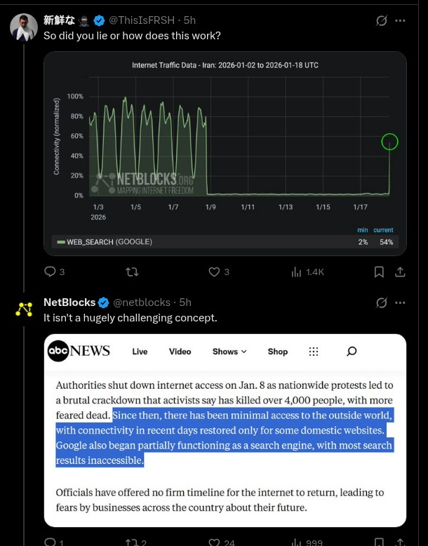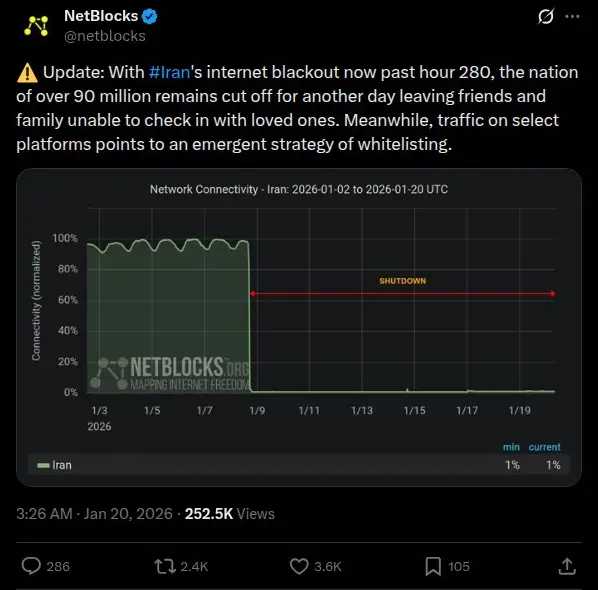 Faced with domestic unrest amplified by social media, Iranian authorities imposed a comprehensive internet shutdown now exceeding nine days—longer than the notorious 2019 blackout. NetBlocks reports that “though news is limited due to the information vacuum, reports indicate thousands have been killed in the subsequent crackdown.”