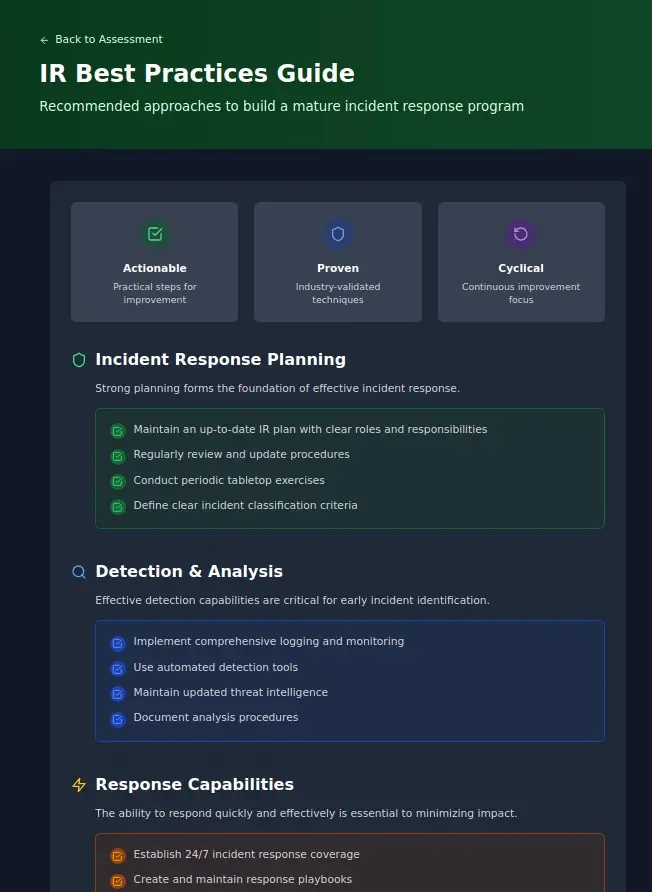 The journey toward IR maturity is continuous rather than a destination. Each assessment provides an opportunity to identify the next most valuable improvements, creating a virtuous cycle of enhancement that strengthens your security posture over time.