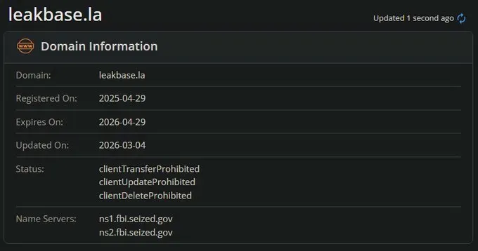 Then, on March 4, authorities moved to the technical disruption phase. The United States and other countries shut down LeakBase, seized its data and two of the domains used by the forum, and posted seizure banners on the LeakBase sites. The domain registration data tells the story cleanly: leakbase.la now resolves to nameservers at ns1.fbi.seized.gov and ns2.fbi.seized.gov. Anyone who visits the site today sees the unmistakable blue seizure splash page bearing the seals of the FBI, Europol, the NCA, Politie, AFP, and a dozen other agencies.
