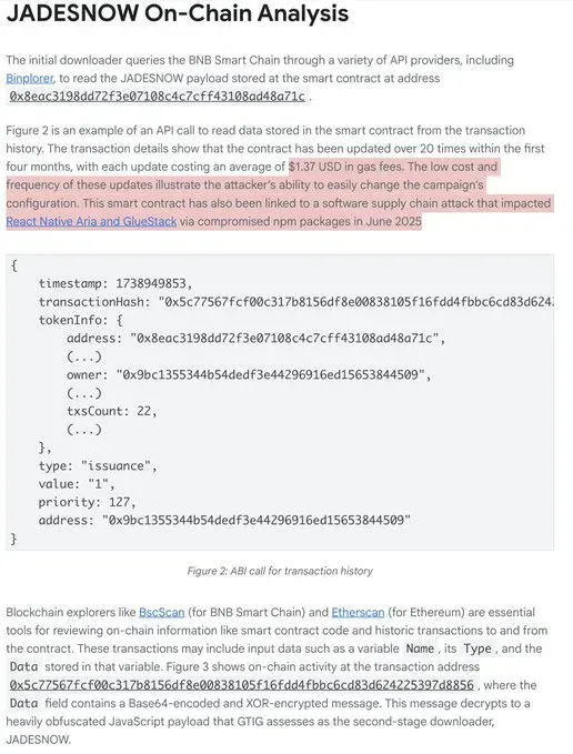The initial downloader queries the BNB Smart Chain through various API providers to read the JADESNOW payload stored in smart contracts. In one analyzed case, the transaction details showed the contract had been updated over 20 times within the first four months, with each update costing an average of $1.37 USD in gas fees.
