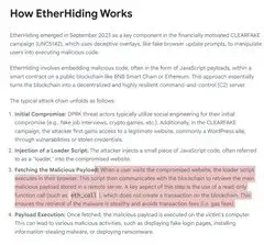 EtherHiding involves embedding malicious code within smart contracts on public blockchains like BNB Smart Chain or Ethereum, essentially turning the blockchain into a decentralized and highly resilient command-and-control server.