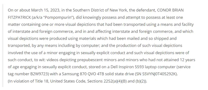 Immediate Admission: According to the FBI affidavit, when arrested, Fitzpatrick stated: “a) his name was Conor Brian Fitzpatrick; b) he used the alias ‘pompompurin/’ and c) he was the owner and administrator of ‘BreachForums.’”