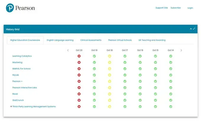 Pearson (educational testing and materials): Multiple products showing red status across their entire grid