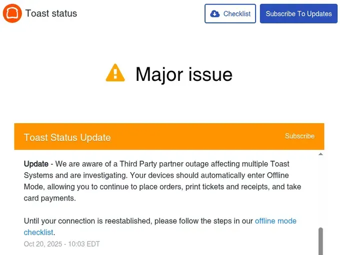 Toast (restaurant POS systems): "We are aware of a Third Party partner outage affecting multiple Toast Systems and are investigating. Your devices should automatically enter Offline Mode, allowing you to continue to place orders, print tickets and receipts, and take card payments."