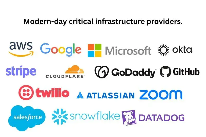 Modern critical infrastructure isn't just the power grid and water supply. It's AWS, Google, Microsoft, Stripe, Cloudflare, GoDaddy, Okta, Twilio, Atlassian, GitHub, Zoom, Salesforce, Snowflake, and Datadog. These companies have themselves become the backbone on which modern businesses, governments, and critical sectors depend.